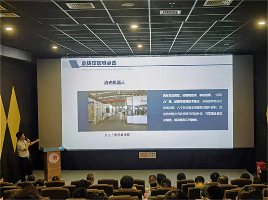 張總監(jiān)介紹到鼎鑄以先進的生產(chǎn)工藝和頂尖的技術力量突破多項鑄造難題,自主研發(fā)創(chuàng)新制造出:低壓鑄造機、清光機器人、數(shù)控鋸切機、機器人打磨單元、全自動射芯機、重力澆鑄機等多款智能化設備,能幫助企業(yè)解決傳統(tǒng)鑄造、拋光打磨等難題,助力行業(yè)發(fā)展。